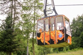 Drei Gondeln der Schauinslandbahn wurden mit flammenden Darstellungen von Tieren aus den südamerikanischen Tropen visuell transformiert: einem Tukan, einem Jaguar und einer Schlange. Sie werden zu Trägern von Geschichten über Feuer, Verlust und Resilienz. Die Idee dazu kam Patricia Domínguez in einem Tierschutzrefugium in Roboré, Bolivien, während der verheerenden Brände von 2019 in der Chiquitanía und im Amazonasgebiet. Dort half sie, verletzte Tiere zu versorgen — darunter ein blinder Tukan, der zum Ausgangspunkt dieser Arbeit wurde.